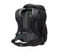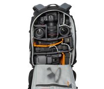 Uvnitř zadní strany se nachází zipové průhledné organizační přihrádky a kapsa CradleFit na notebook, která pojme až 16" MacBook Pro. Boční vstupy mají velké vnější pružné kapsy, které pojmou až 1L láhev, a jsou zpevněné na spodní straně pro podporu stativu. Další poutka a kapsy na horní části boků umožňují rychlý přístup k věcem a bezpečné připevnění stativu. Batoh stojí samostatně, což usnadňuje manipulaci a přístup k vybavení.